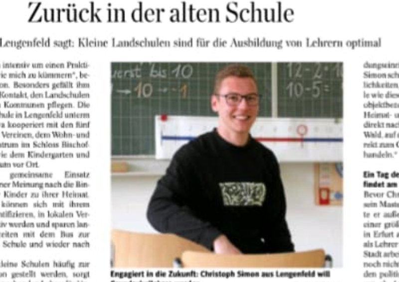 Christoph Simon, Lehramtsstudent aus Erfurt, betont die Wichtigkeit von kleineren Dorfschulen. Individuelleres Begleiten, kleinere Klassen, flexible Absprachen und familiäres Kollegium zeichnen neben der modernen Ausstattung gerade die Grundschule in Lengenfeld unterm Stein aus. Dies sei für ihn als Studenten wichtig. Sein Anliegen verbreitete die TA im Lokalteil von Mühlhausen.