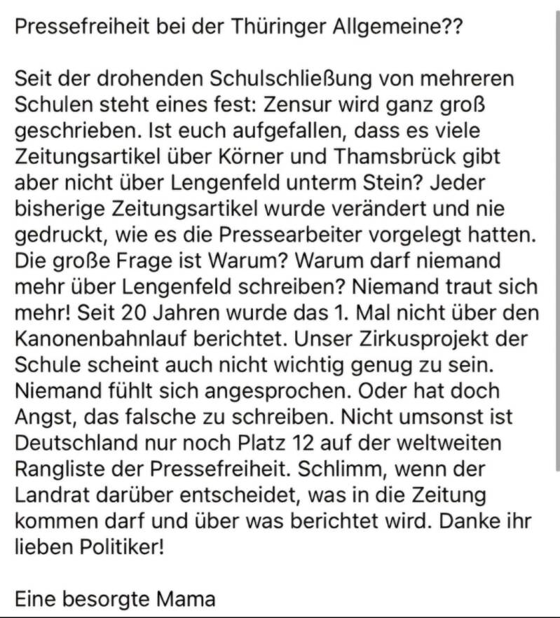Ein weiteres Mal betonen die Lengenfelderinnen und Lengenfelder ihr Anliegen und trugen es der TA vor. Sie berichtete auch über die Kooperation mit dem Priorat und -leider verspätet- über den Kanonenbahnlauf. Ein Ausschnitt aus dem Artikel vom 15.05.2025 ist links zu sehen. Vorher äußerten sich gerade die Eltern kritisch gegenüber der Berichterstattung des Engagements der Grundschule Käthe-Kollwitz.